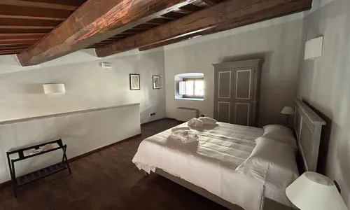 Il nobile edificio è caratterizzato da un pittoresco prospetto con doppio loggiato superiore ad archi, che delimita, su due lati, la piccola corte giardino posta davanti all'edificio e cinta da mura sugli altri due lati.