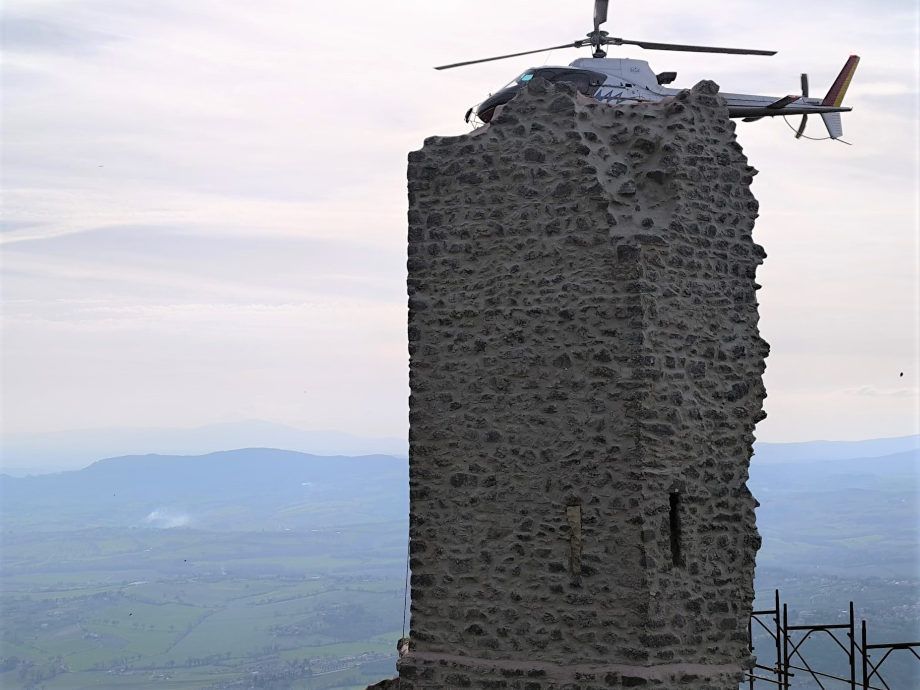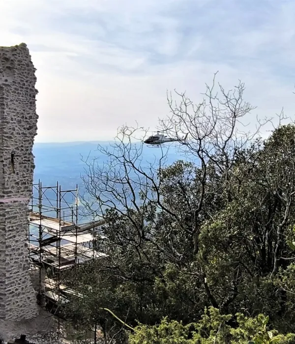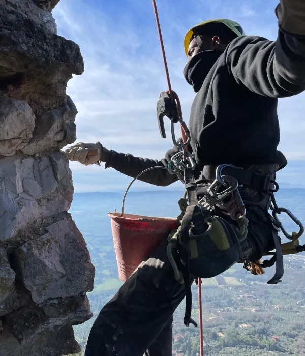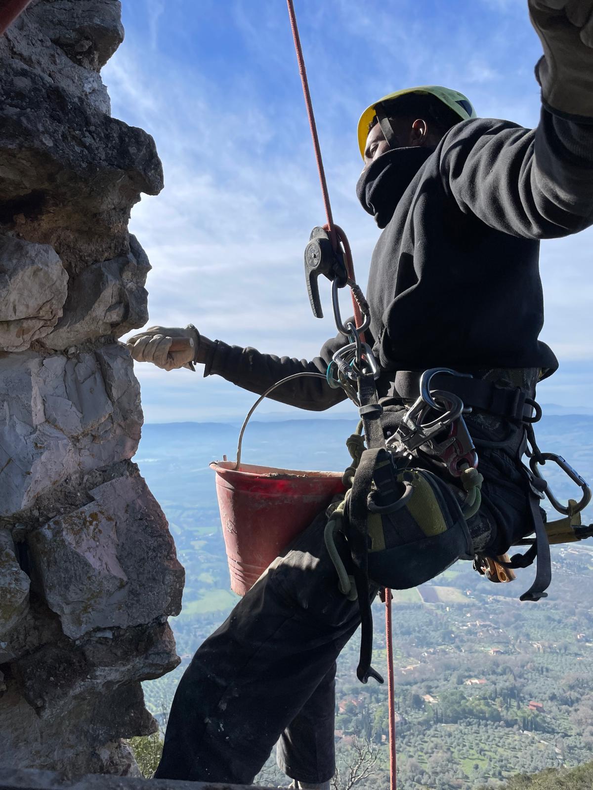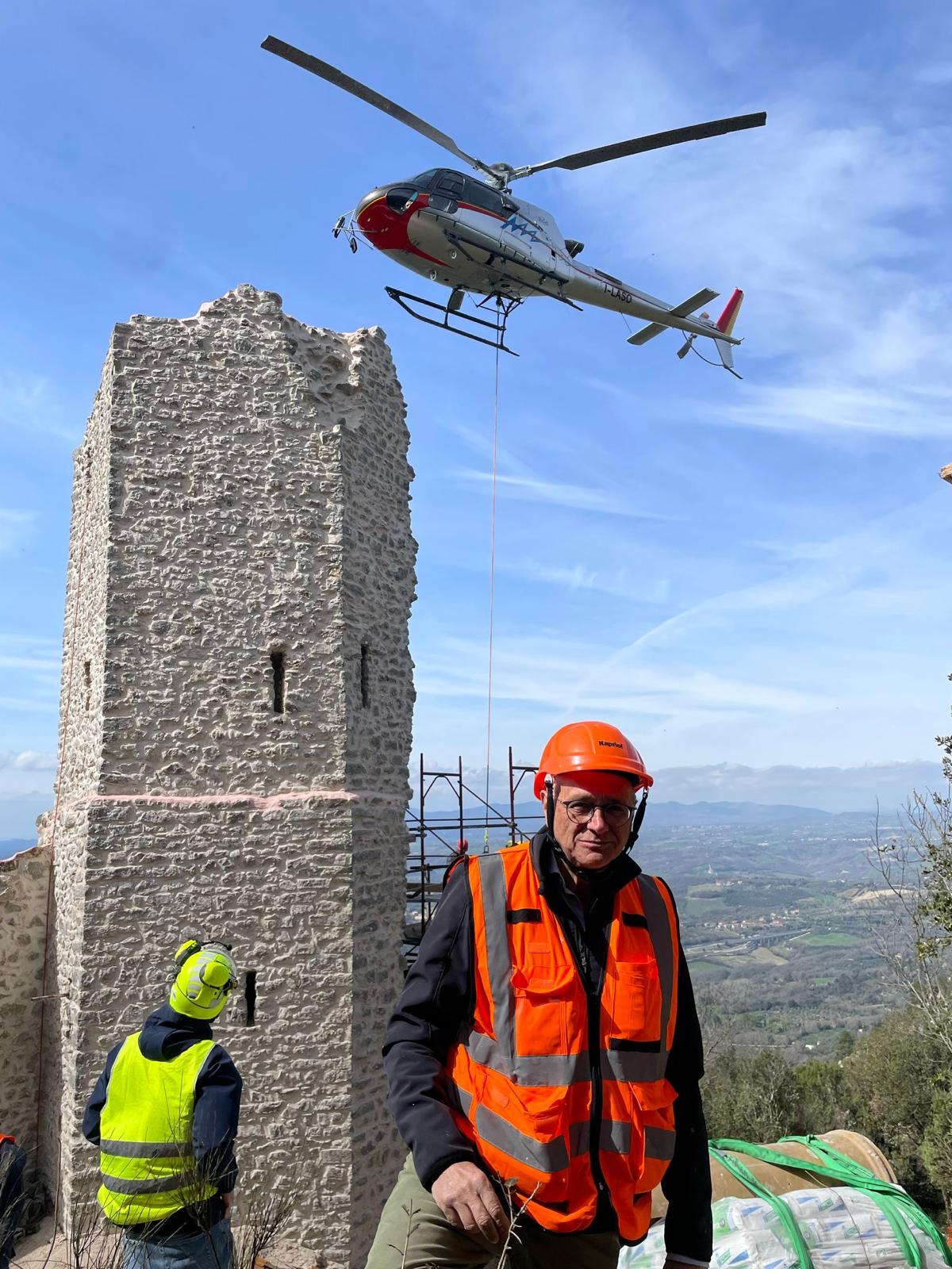 “Un restauro vissuto come un’avventura” - Il restauro durato dall’autunno del 2024 alla primavera del 2025, in alcuni passaggi, è stata una vera e propria avventura. Vissuta con grande professionalità, ma anche con passione. “A un certo punto per papà questo lavoro era diventata una specie di ossessione”, scherza Agnese. “In realtà sono serviti una serie di accorgimenti, di tecniche non certo consuete e una grandissima attenzione alla logistica. Molti materiali edili sono stati trasferiti dalla nostra base al termine della strada che sale da Cesi davanti al pianoro di Sant’Erasmo, fin sul picco della rocca e poi nelle pareti sottostanti grazie a un elicottero che arrivava dal Lazio. Ogni volta che veniva faceva almeno 90 movimenti trasportando al massimo sette quintali di materiali per ogni volo”.